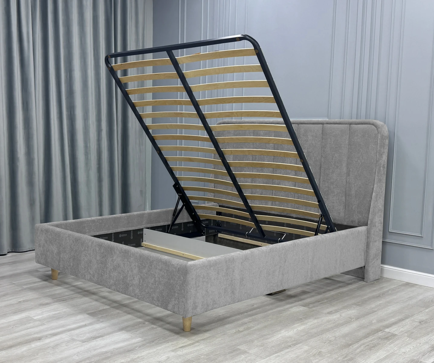 Съемные чехлы крепятся на царги кровати на ленту -липучку и позволяют легко ухаживать за тканью - при необходимости можно произвести чистку специальными мебельными средствами или отдать в химчистку. Также такие чехлы обеспечивают эстетичный «цельный» вид кровати без видимых стыков в местах соединения царг.