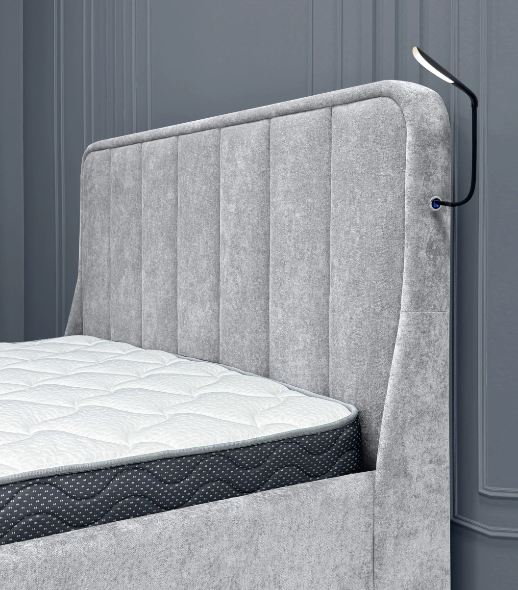 Интерьерная кровать «Milena 2» - трендовая модель выполненная в популярном дизайне с округлыми формами и отдельными пышными вставками с вертикальной прямой геометрией. Возможность дополнительного оснащения: разъем с подсветкой с USB и Type-C разъемами для быстрой зарядки устройств прямо в кровати и LED-светильник с 3 режимами освещения на гибкой основе для максимально комфортного освещения.