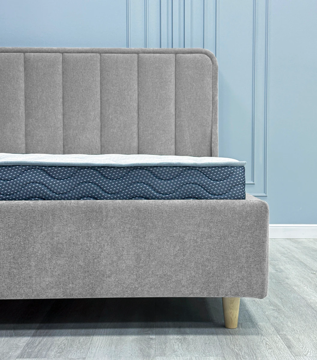 Дизайн изголовья формируется из округлой рамки и отдельных вертикальных вставок, которые изготавливаются и обтягиваются отдельно. Благодаря такому сочетанию все элементы изголовья имеют ярко выраженную выпуклую форму, что придает кровати премиальный внешний вид. Объемные мягкое изголовье